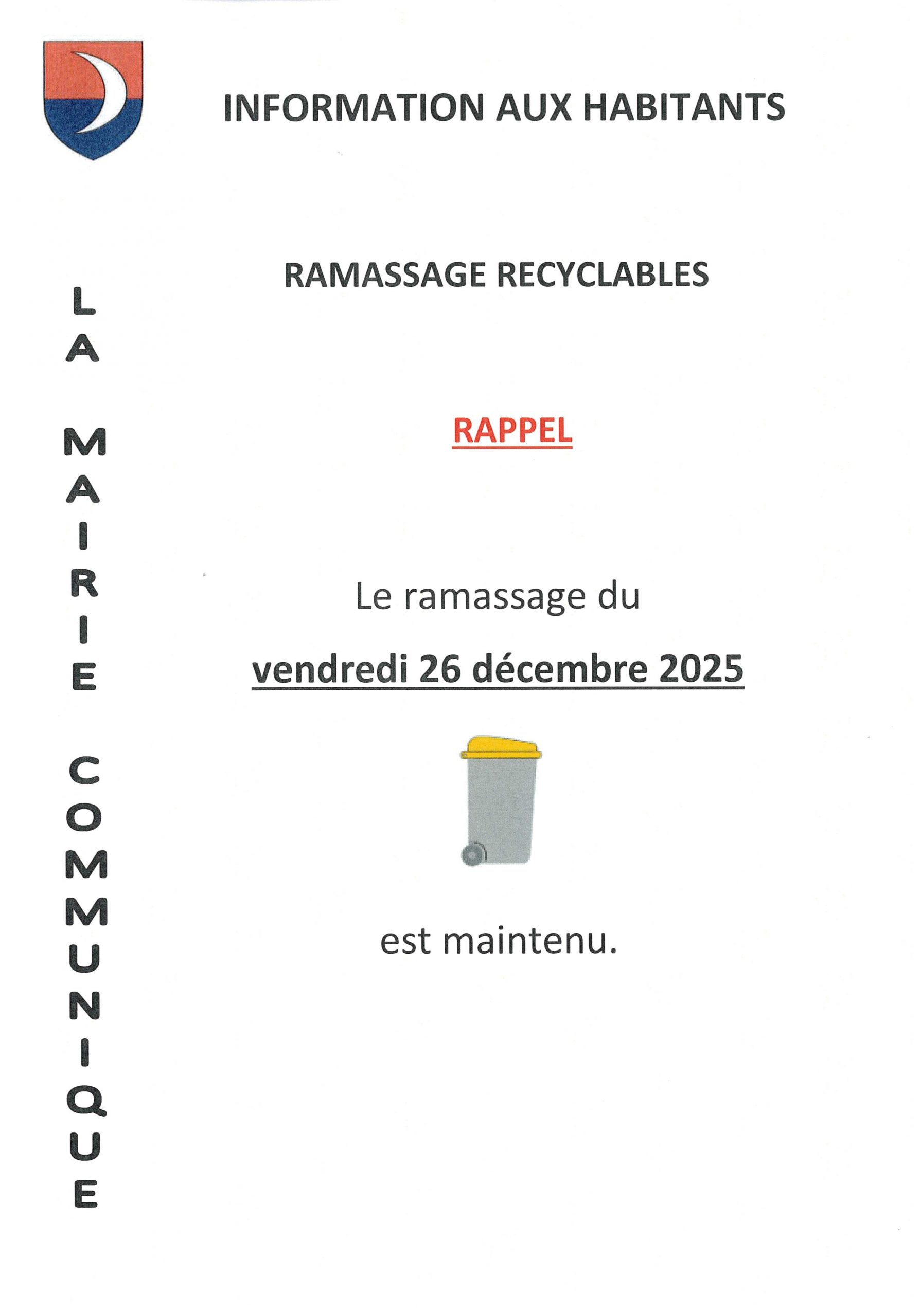 La Mairie Communique 2025 : La mairie communique – Ramassage recyclables (26.12.25) DECHETERIE MOBILE Calendrier 2026 CALENDRIER OM 2026 La mairie communique – invitation voeux 2026 Syndicat Mixte de la Thur Amont – Protection contre les INONDATIONS La Mairie Communique – Collecte Banque Alimentaire 2025 Concert de L’Avent -Les Joyeux Vignerons ( 29- 11- 25 ) La mairie communique – INVITATION 11.11.25 Les Pompiers Communiquent – Contrôle DECI 2025 Dates battues de chasse 2025.2026 Ateliers La bonne assiette (du 19/09 au 29/11/2025) Flyer Bien-Etre & Sport RANSPACH 2025-2026 La Mairie Communique – Relevé compteurs eau SAUR 2025 Quête Ligue contre le cancer (06.2025) Marché aux puces – fermetures des rues (08.05.2025) La mairie communique – Invitation cérémonie 07.05.25 La mairie communique – Travaux rue Général de Gaulle 06.05.2025 La mairie communique – Travaux rue Général de Gaulle 28.04.2025 La Mairie Communique – Journée citoyenne 2025 RAPPEL – Concert caritatif pour Elise 22.02.25 Commande bois 2025 – BON DE COMMANDE Commande bois 2055 – REGLEMENT Territoire Energie Alsace – Aide Happy gaz vert Concert caritatif pour Elise La Mairie Communique – TRAVAUX marquage au sol 20.01.25 La Mairie Communique – Collecte sapins de Noël 2025 2024 : La Mairie Communique – Collecte Banque Alimentaire 2024 Concert de l’Avent (30.11.24) – Les Joyeux Vignerons La Mairie Communique – Commémoration des 80 ans de la Libération La Mairie Communique – Invitation cérémonie 11 novembre 2024 La Mairie Communique – TRAVAUX toiture église 13.11.2024 Les Pompiers Communiquent – Contrôle eau défense incendie Affiche battues de chasse 2024.2025 Journée Citoyenne 2024 La mairie communique – TRAVAUX RD 1066 (08.2024) La Mairie Communique – Relève des compteurs d’eau 2024 ENEDIS – Coupures de courant pour travaux La Mairie Communique – Kits biodéchets La Mairie Communique – Marché aux puces (fermetures des rues 08.05.24) La Mairie Communique – Invitation cérémonie 07.05.24 La Mairie Communique – Atelier initiation tablette numérique La Mairie Communique – Ramassage ordures ménagères (29.03.24) La Mairie Communique – Déjections canines Commande bois 2024 – REGLEMENT Commande bois 2024 – BON DE COMMANDE 2023 : Battues de chasse 20-et-21.01.2024 Réunions d’informations – Collecte des déchets Sapins de Noël 2024 Distribution ECOSACS 2024 La Mairie Communique – Décorations Noël 2023 La Mairie Communique – Remerciements Journée Citoyenne 2023 La Mairie Communique – Collecte Banque Alimentaire 2023 La Mairie Communique – Cérémonie du 11 novembre 2023 Tournée de l’orientation apprentissage métiers (08.11.23) Affiche battues de chasse 2023.2024 Contrôle poteaux incendie (15.10.2023) La Mairie Communique – Permanence accueil SAUR La Mairie Communique – Coupure d’eau (21.09.23) Journée Citoyenne 14.10.2023 La Mairie Communique – Alerte aux orages (25.08.23) La Mairie Communique Alerte aux orages (11.07.23) La Mairie Communique – Ramassage ordures ménagères (15.07.23) La Mairie Communique – Ouverture City (Eté 2023) La Mairie Communique – Relève des compteurs d’eau 2023 Flyer Fête de la Musique 21.06.23 La Paroisse Communique – Fête de la Saint-Antoine 11.06.2023 La Mairie Communique – Passage Tour de la Mirabelle (27.05.2023) La Mairie Communique – Tranquilité publique (bruits-brûlage des végétaux-taille des haies) Quête Ligue contre le Cancer (mai et juin 2023) Marché aux puces – Fermetures des rues 08.05.2023 La Mairie Communique – Invitation cérémonie 07.05.2023 Collectif des Possibles – Collecte d’images bûchers La Mairie Communique – Travaux rues du village 04.2023 La Mairie Communique – Travaux rue de l’Ecole 17.04.2023 La Mairie Communique – Ramassage ordures ménagères 07.04.23 La Mairie Communique – Ramassage encombrants 05.04.23 La Mairie Communique – Coupure d’eau 03.04.23 Les pompiers de Ranspach recrutent Affiche battue de chasse supplémentaire 2023 La Mairie Communique – Distribution ECOSACS 2023 2022 : Notice sur la différence entre chats errants et chats libresTélécharger Fourrière de Ranspach – SPA de MulhouseTélécharger